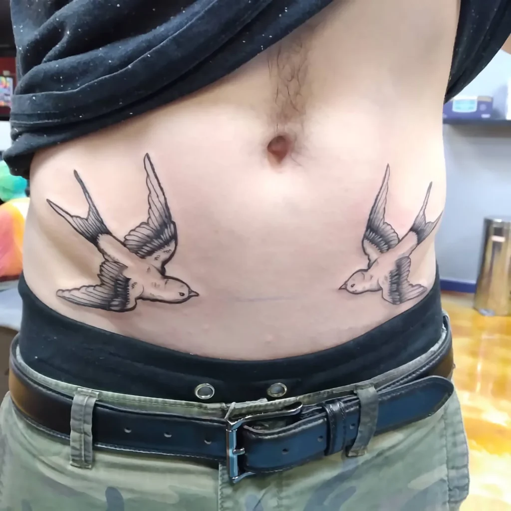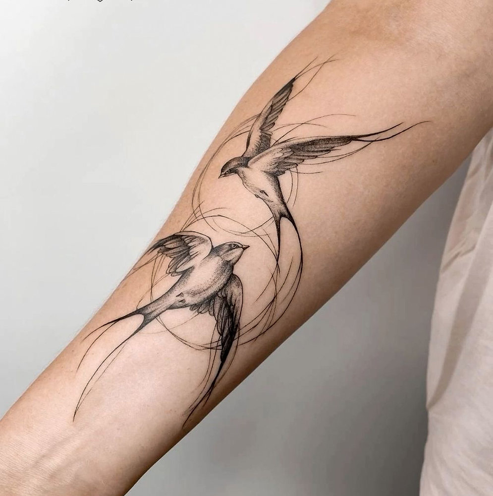 Тату дві ластівки значення має особливе, адже пара птахів часто символізує любов, партнерство чи міцний зв’язок із кимось важливим. У морській традиції дві ластівки могли означати подолання більшої відстані або подвійну удачу. У сучасному контексті дві ластівки можуть уособлювати вірність у коханні, дружбу чи сімейну гармонію. Наприклад, пара ластівок на зап’ясті чи ключиці може бути присвятою коханій людині чи символом єдності з рідними.